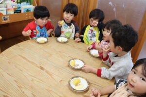 5歳児さんがサツマイモを育てていました。さぁ収穫したサツマイモはどうする?色々な意見が出た中でスィートポテトにしようとまとまり5歳児、皆で作りました。畑を借りたお礼もしたいと作ったスィートポテトを持ってお母さん先生のおうちに皆でお礼をしに行きました。とても喜んでくれたらしくそのお礼にとリコーダーでクリスマスの曲を聞かせてくれました❣